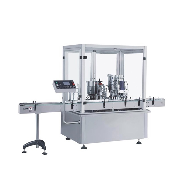 Жидкость для электронных сигарет, машина для наполнения, укупорки и укупорки капель для нанесения круглых бутылок с каплями для глаз или аналогичных бутылок, автоматическое заполнение продукта, установка пробки, установка крышки, завинчивание крышки. Машина состоит из загрузочного поворотного стола, керамического поршневого насоса (альтернативный перистальтический насос) и наполнительных насадок, сортировщика пробок и крышек, устройства для установки пробок и крышек, системы навинчивания крышек, разгрузочного лотка. Загрузка/выгрузка бутылок осуществляется вручную, через загрузочный поворотный стол Ø500 мм и разгрузочный лоток, или непосредственно с производственной линии. Он разработан и изготовлен в соответствии с правилами GMP.