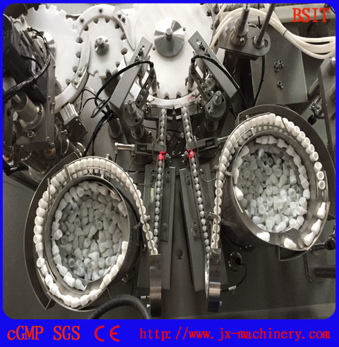 Жидкость для электронных сигарет, машина для наполнения, укупорки и укупорки капель для нанесения круглых бутылок с каплями для глаз или аналогичных бутылок, автоматическое заполнение продукта, установка пробки, установка крышки, завинчивание крышки. Машина состоит из загрузочного поворотного стола, керамического поршневого насоса (альтернативный перистальтический насос) и наполнительных насадок, сортировщика пробок и крышек, устройства для установки пробок и крышек, системы навинчивания крышек, разгрузочного лотка. Загрузка/выгрузка бутылок осуществляется вручную, через загрузочный поворотный стол Ø500 мм и разгрузочный лоток, или непосредственно с производственной линии. Он разработан и изготовлен в соответствии с правилами GMP.