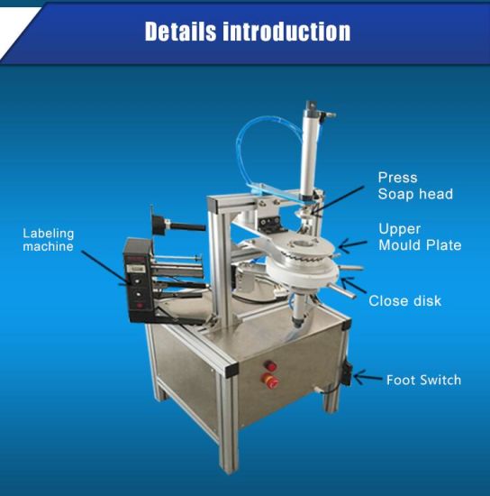 сначала поднимает верхнюю пластину формы и помещает упаковочный материал в подходящее положение, затем кладет качающийся стержень, собранный вместе верхнюю и нижнюю форму, кладет спичечное мыло. Откройте закрытый диск, закройте диск поверните направо до конца, нажмите на мыльную головку автоматически, нажмите на мыло, закройте закрытый диск после того, как нажмите мыльную головку автоматически назад, затем закройте диск поверните налево и нанесите маркировку. В конце откройте закрывающий диск и удалите готовое мыло, нажав на педальный переключатель.