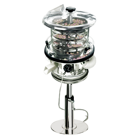3. В процессе таблетки полируются. Когда таблетки перемещаются на самый нижний диск, сжатый воздух сдувает пыль, которая всасывается пылесборником D.